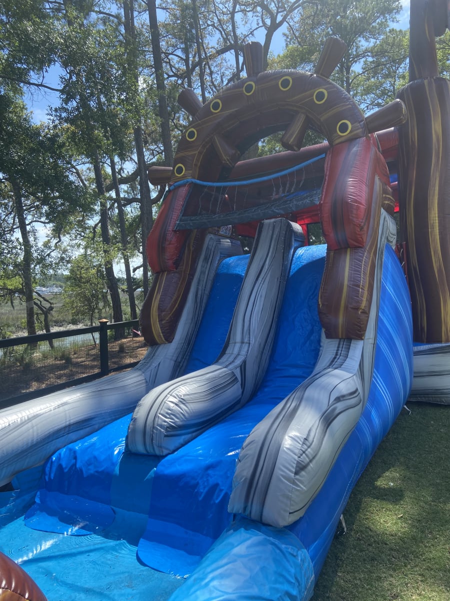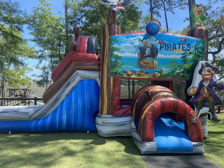 A Pirate's life is a life for me! Something about pirates that everyone loves. Kids can have a swash-buckling good time in the bounce and slide bounce house combo. The amazing graphic detail will keep guests in awe, but the huge jump area, basketball goal and slide will keep the young mates busy all day jumping, playing and sliding wet or dry. So break out the treasure chest full of doubloons and rent the Pirate Cove Combo today!