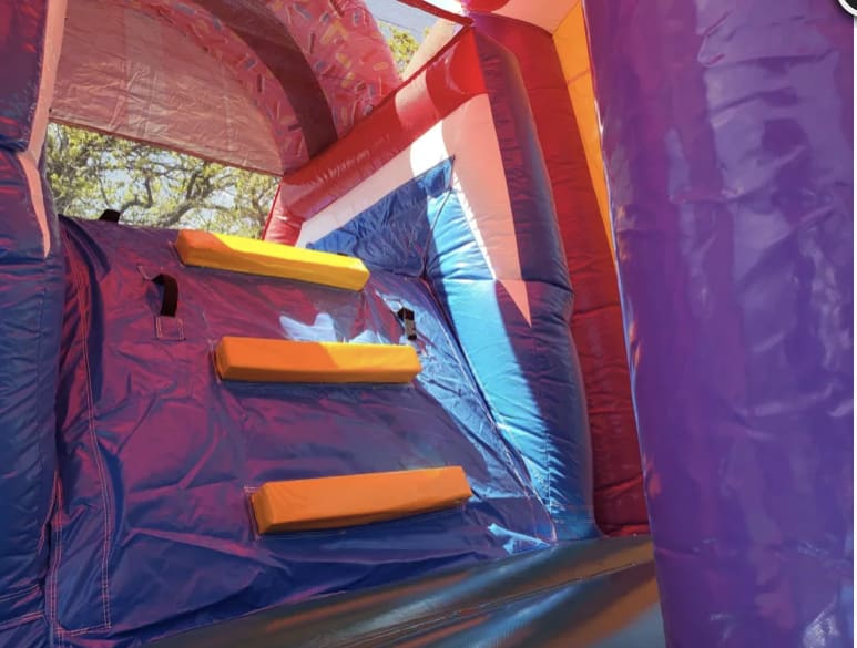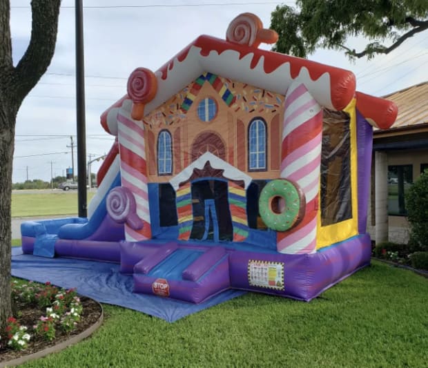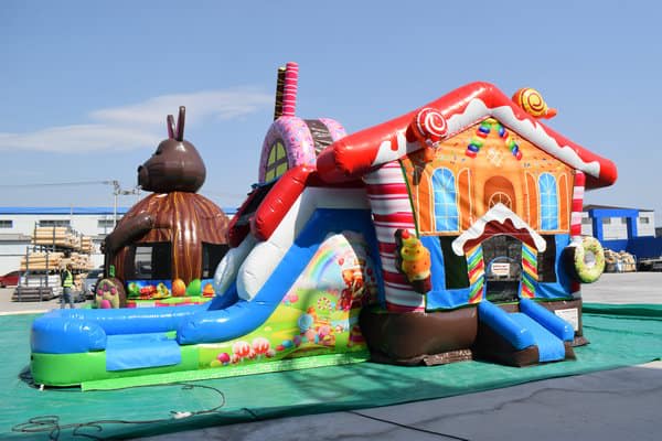 This brand new combo goes great with any party theme! This bounce house combo with slide is truly magical! This bounce and slide combo will make childs dream trip to the candy shop come true! It has a bouncing area, basketball goal, climbing wall, and a single lane slide.