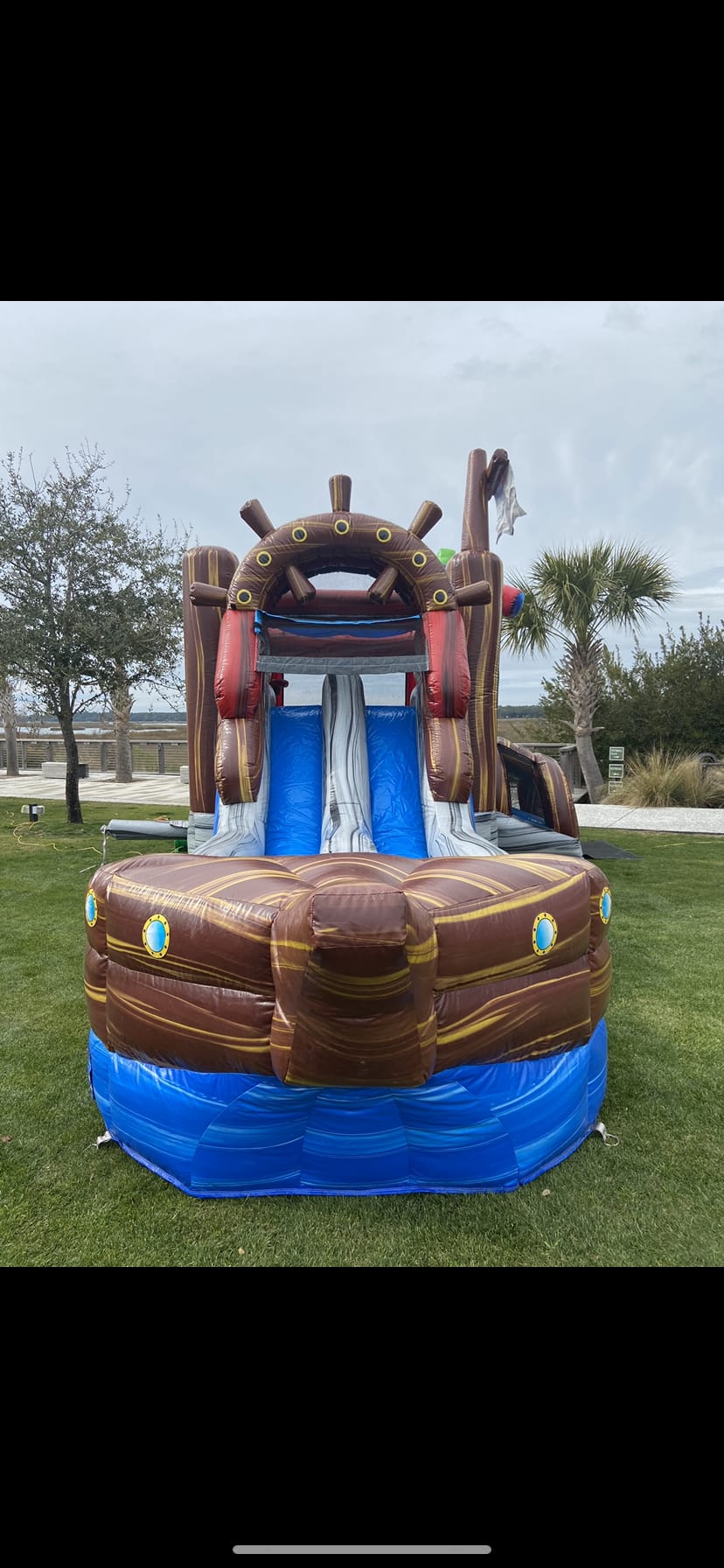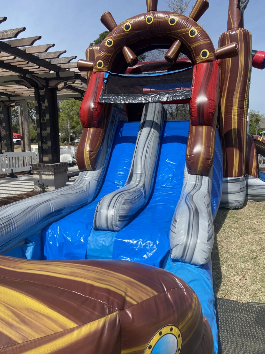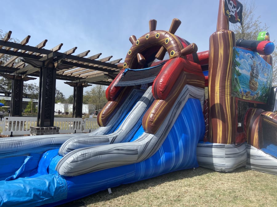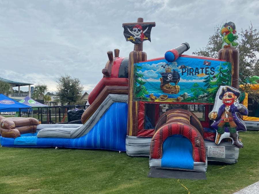 A Pirate's life is a life for me! Something about pirates that everyone loves. Kids can have a swash-buckling good time in the bounce and slide bounce house combo. The amazing graphic detail will keep guests in awe, but the huge jump area, basketball goal and slide will keep the young mates busy all day jumping, playing and sliding wet or dry. So break out the treasure chest full of doubloons and rent the Pirate Cove Combo today!