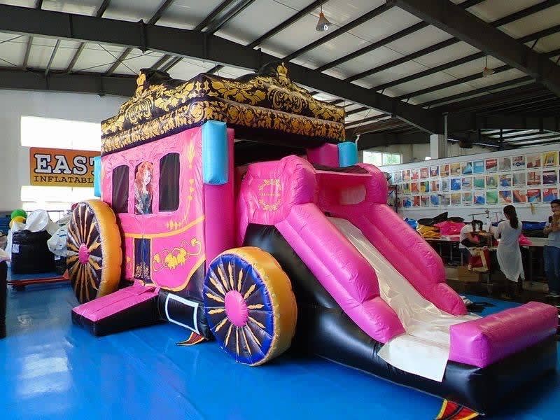 This beautiful Princess Carriage inflatable combo is a real sight to see. Let your princess enjoy her special day with her very own beautiful Princess Carriage. Everyone at the event will be talking about this beautiful princess inflatable combo. Let your party guests bounce, climb, and slide! This is a for Dry use only.