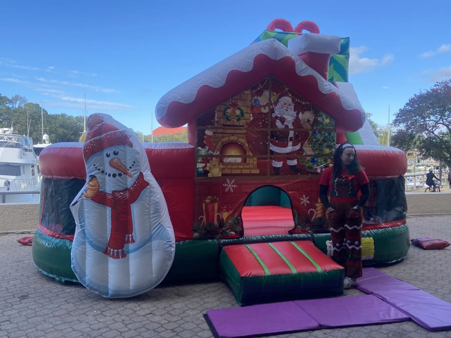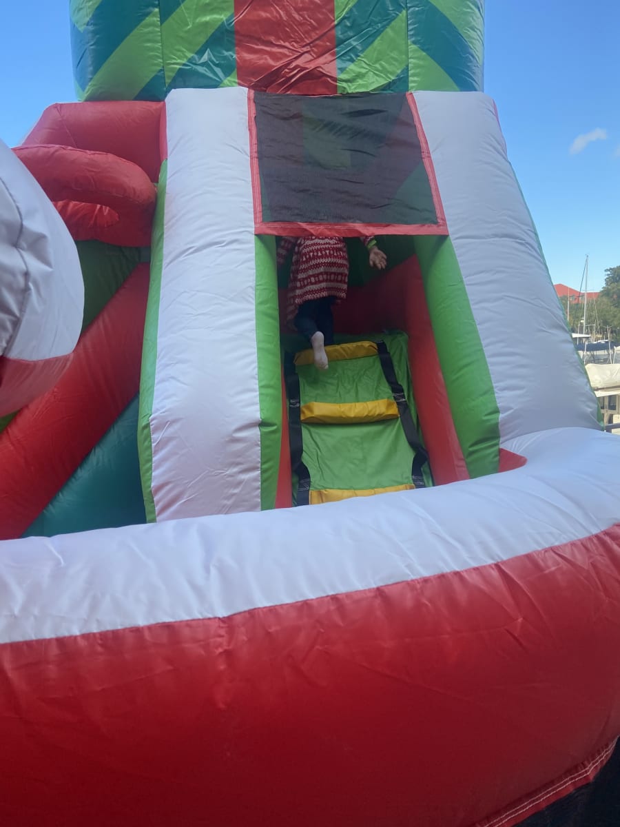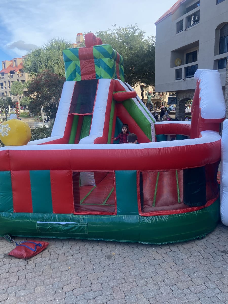 This amusement playland is specific designed for the upcoming Christmas. The front wall has Santa & Snowman for decoration, the middle is basketball hoop, and the back is the fun climbing wall and slide, even has the present style top. This Christmas Gift Playland not only serves as a fun provider, but also makes your party more festive.