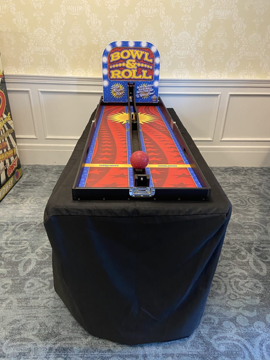 Part of our carnival style game lineup. Roll the ball at the PERFECT speed and trajectory and hope it doesn't come back to you. A game of precision and skill. Includes table with rental if requested.