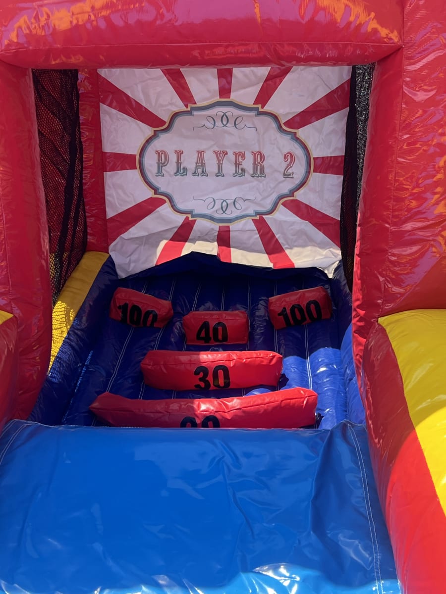 The inflatable Skee Ball is a bigger version of your favorite arcade game skeeball! Roll the balls down the lane and aim for the targets with the most points! Play for accuracy, for the highest score, or just for the fun of it! Scoring is done manually by velcro number markers on the front of the game that coordinates with the numbered hole.