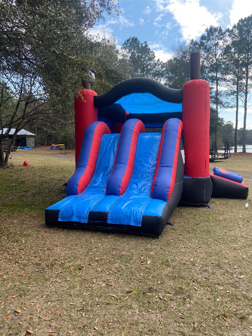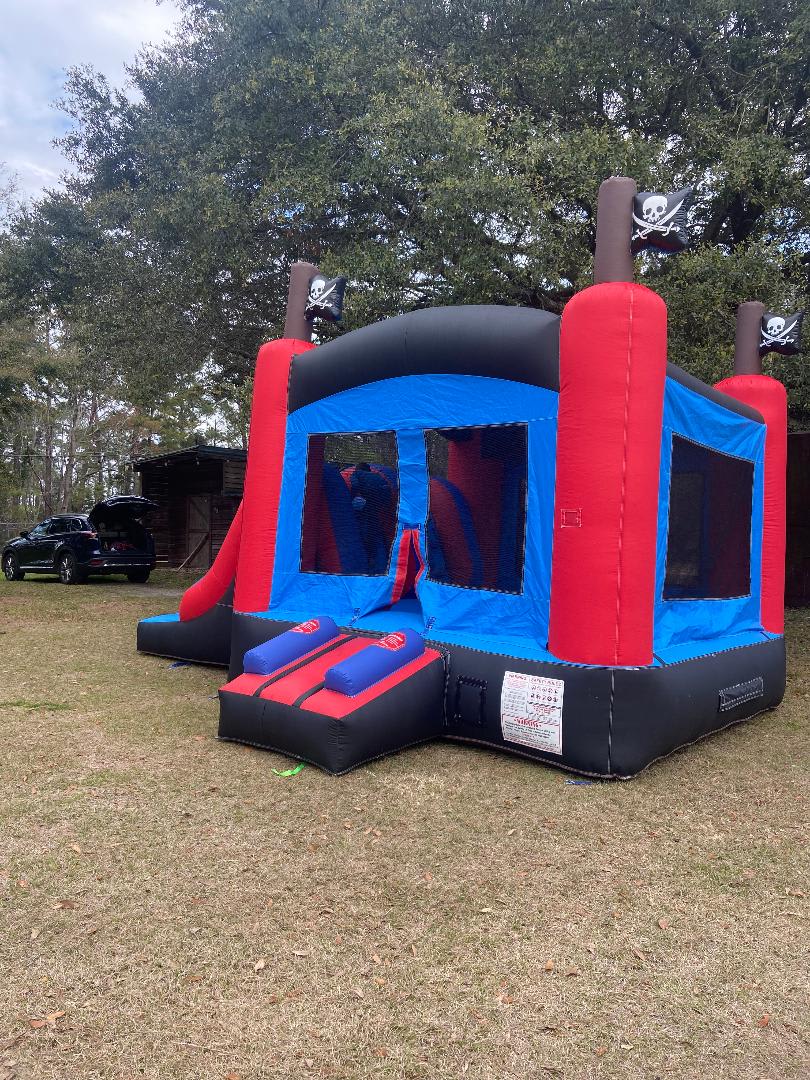 Ahoy Maties! It's the Pirate's Life for Me! This bounce house will wore the kids out It also has a double lane slide, this unit is ideal for children 4 & Under.