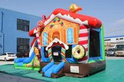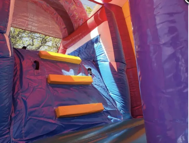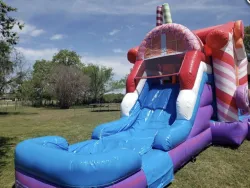 This brand new combo goes great with any party theme! This bounce house combo with slide is truly magical! This bounce and slide combo will make childs dream trip to the candy shop come true! It has a bouncing area basketball goal climbing wall and a single lane slide.