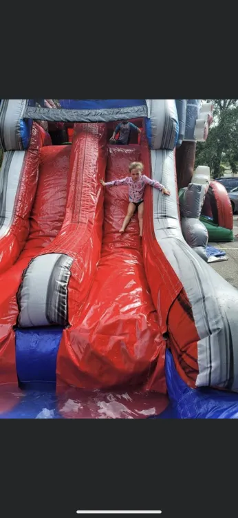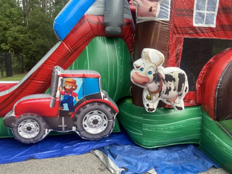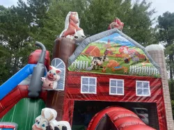 Our Friendly Farm Combo is sure to make a hit at your next party or event! This combo is perfect for the hot Florida weather it is fun for all ages and even has a splash pad at the end making it safe for all ages! With the dual lanes sliders can race down to see whose faster!