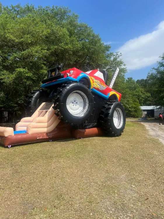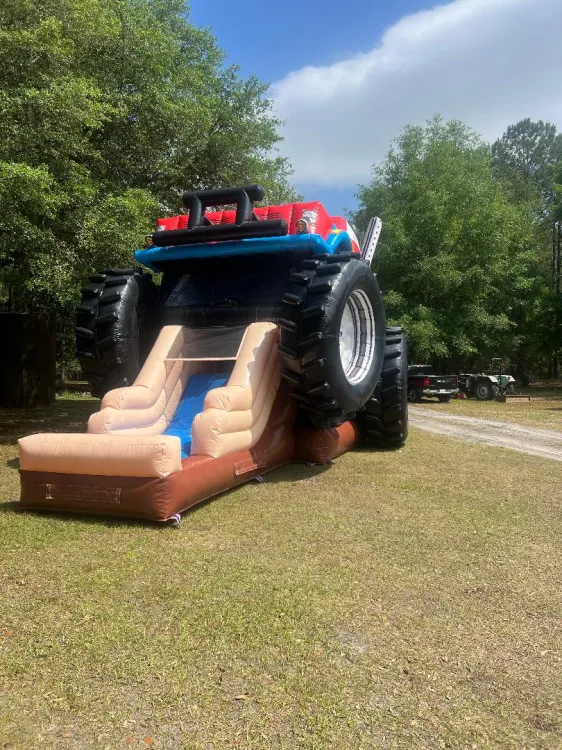 Huge 3D Monster Truck Jumper Slide Combination Ride. One of the largest inflatable combination rides available. This inflatable Monster Truck will make your next party or event a huge success. This unique inflatable bounce house combo features a large bouncing area a climb & slide. Great for auto dealer promotions and "Blaze and the Monster Machines" parties too!