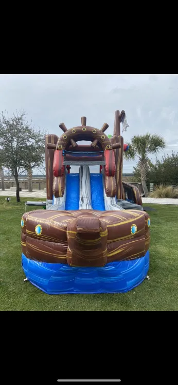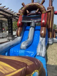 A Pirate's life is a life for me! Something about pirates that everyone loves. Kids can have a swash-buckling good time in the bounce and slide bounce house combo. The amazing graphic detail will keep guests in awe but the huge jump area basketball goal and slide will keep the young mates busy all day jumping playing and sliding wet or dry. So break out the treasure chest full of doubloons and rent the Pirate Cove Combo today!