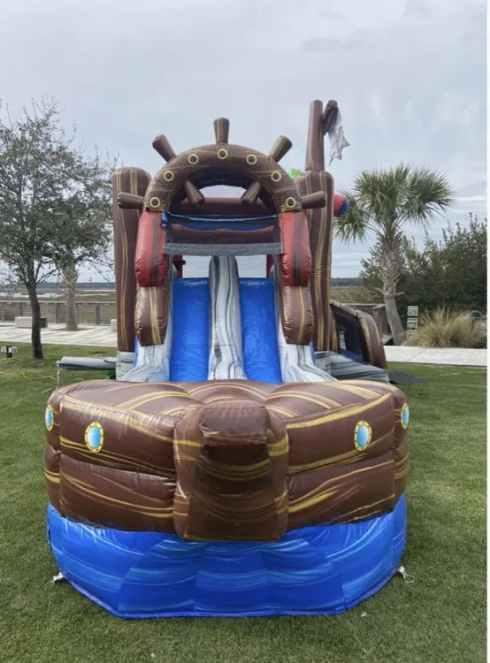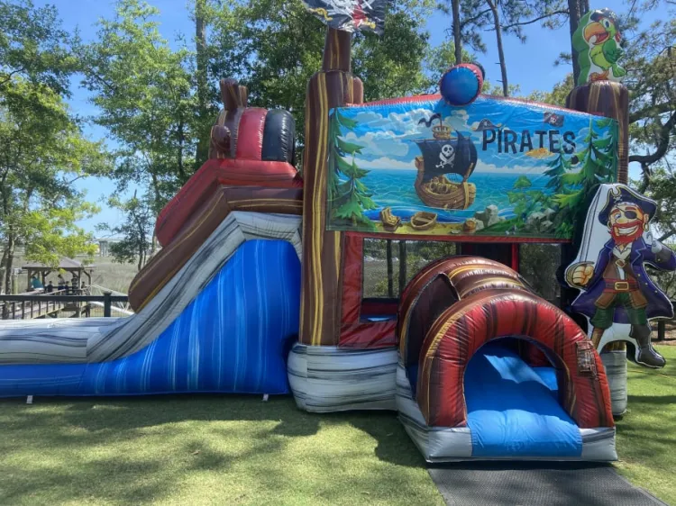 A Pirate's life is a life for me! Something about pirates that everyone loves. Kids can have a swash-buckling good time in the bounce and slide bounce house combo. The amazing graphic detail will keep guests in awe but the huge jump area basketball goal and slide will keep the young mates busy all day jumping playing and sliding wet or dry. So break out the treasure chest full of doubloons and rent the Pirate Cove Combo today!