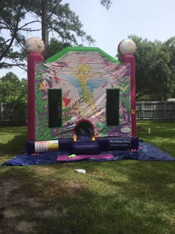 This Tinker Bell bounce house will bring the essence of Disney with a little pixie dust to your next party. On this bounce house the gorgeous artwork depicts Tinker Bell spreading some enchantment throughout her flower-filled pixie land and urging everyone to believe in the magic! Kids will certainly become believers as they jump to their hearts content with the fluttering branding icon of Disney on this bounce house.