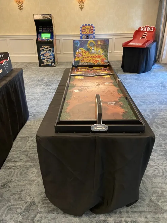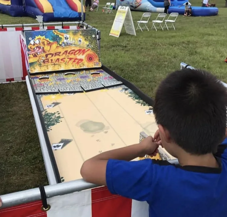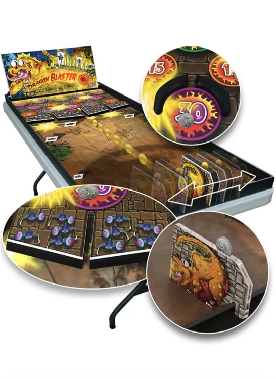 Our Dragon Blaster Coin Roll Game is a fun way to put those coins to use. A player inserts a quarter into the dragon slot then rolls it to the castle while avoiding obstacles in the way. Collect points where the quarter lands!