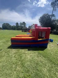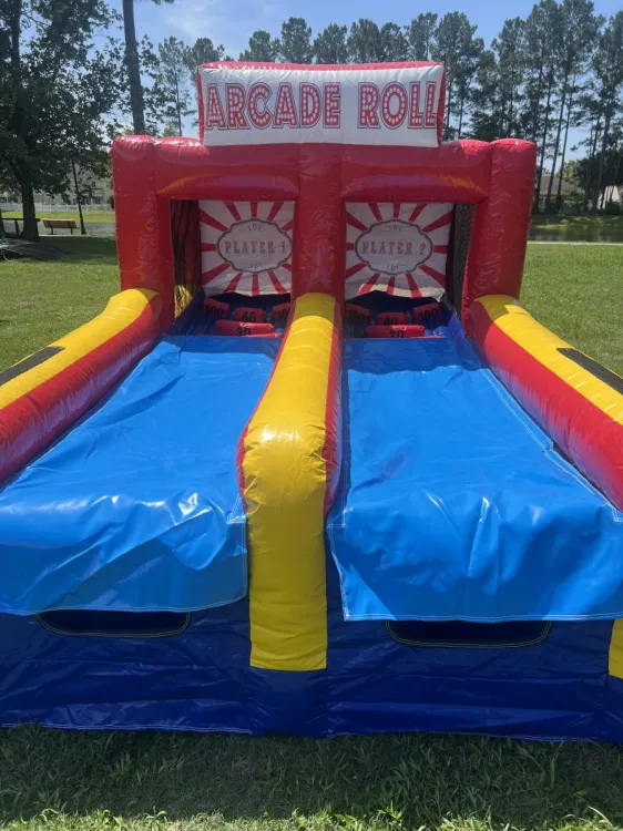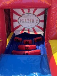 The inflatable Skee Ball is a bigger version of your favorite arcade game skeeball! Roll the balls down the lane and aim for the targets with the most points! Play for accuracy for the highest score or just for the fun of it! Scoring is done manually by velcro number markers on the front of the game that coordinates with the numbered hole.