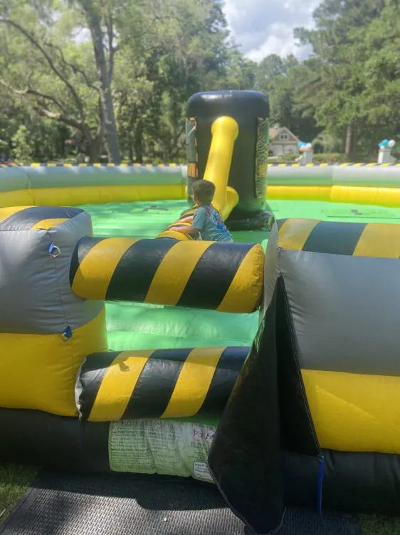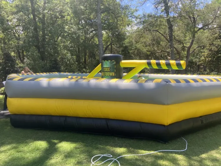 - OCCUPANCY: A maximum of 5-6 kids of equal size at one time for bounce houses, and 1 person at a time for slides is what most inflatable manufacturers recommend.