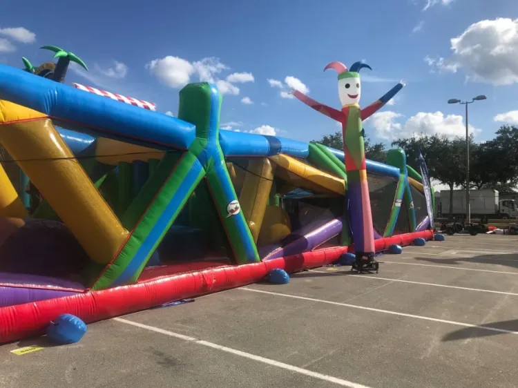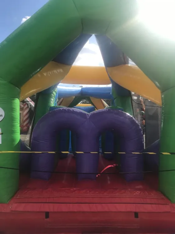 Check out our 100 ft long Inflatable Obstacle Course. This obstacle is great for Large School Events or Church Events. Kids line up side by side and run through the tunnels dodge past the pop ups squeeze through the log jams up and over and through and then hit the slide. Climb up to the top and slide down and...whew! Done.