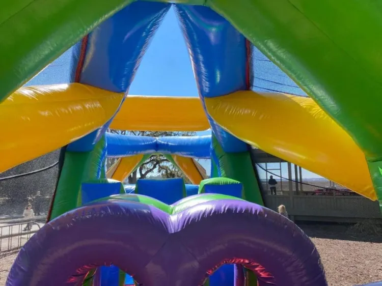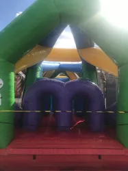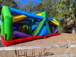 This unique inflatable obstacle course is unlike traditional obstacle courses with solid walls featuring sides that have support pillars and finger-safe netting allowing a full view from the outside for safe supervision of participants. Watch as eager kids run duck crawl climb jump and weave their way through various obstacles in a race to the finish line.