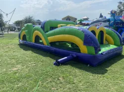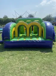 Racers start this Obstacle Course diving through the wall then squeeze through the pillar wall around inflated side posts scramble through tunnels more inflated walls and out the back to become the victor!