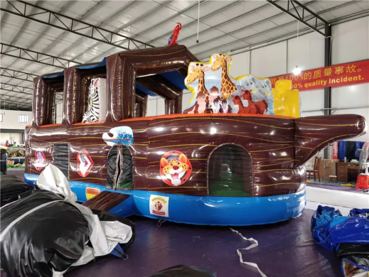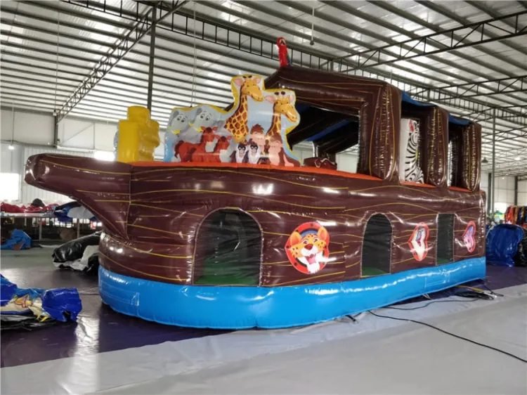 • Spectacular!! A playhouse fit for a toddler! Yes and actual inflatable ark filled with vertical & horizontal obstacles decorated with Lions sheep monkeys & more! A large spacious interior area over 20' long with an interior slide as well. The very best part our Noah's Ark Toddler Town is COVERED to protect children on those sunny hot days. For the adults screened "portholes" so you can view your little ones enjoying. Entrance has safety netting as well as padded ramp.. Suitable for kids 4 & Under.