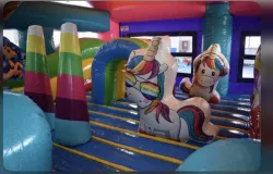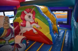 Unicorn Land Toddler Bounce that is designed especially for this age group. An assortment of cheerful unicorns and colorful rainbows add a playful element that this age group really seems to enjoy. Lots of fun spaces to crawl through and over keep them moving and interested in self-led play activities.