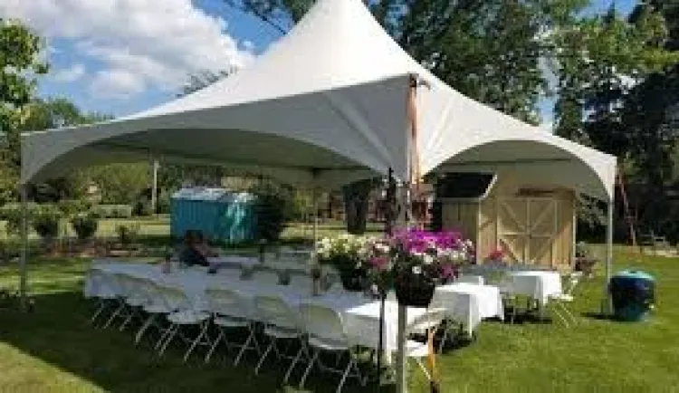 This white high-peak frame tent seats 80-96 comfortably but can seat up to 120 guests. It’s a perfect wedding tent rental. They accommodate twelve 8′ long banquet tables or ten 6’ round tables.